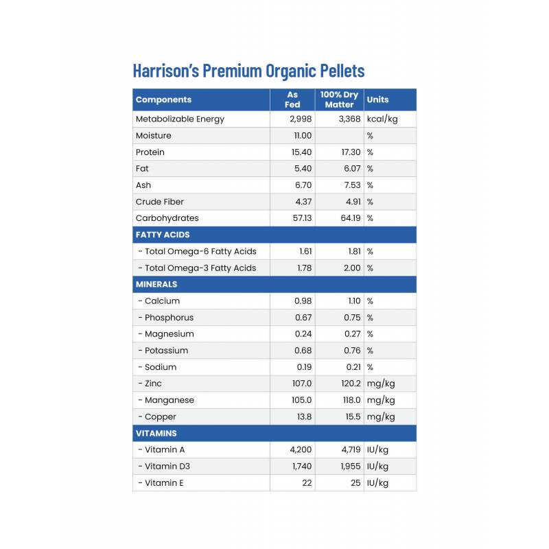 Harrisonove organske premium pelete so zasnovane tako, da zadovoljujejo prehranske potrebe majhnih do srednje velikih domačih ptic.
